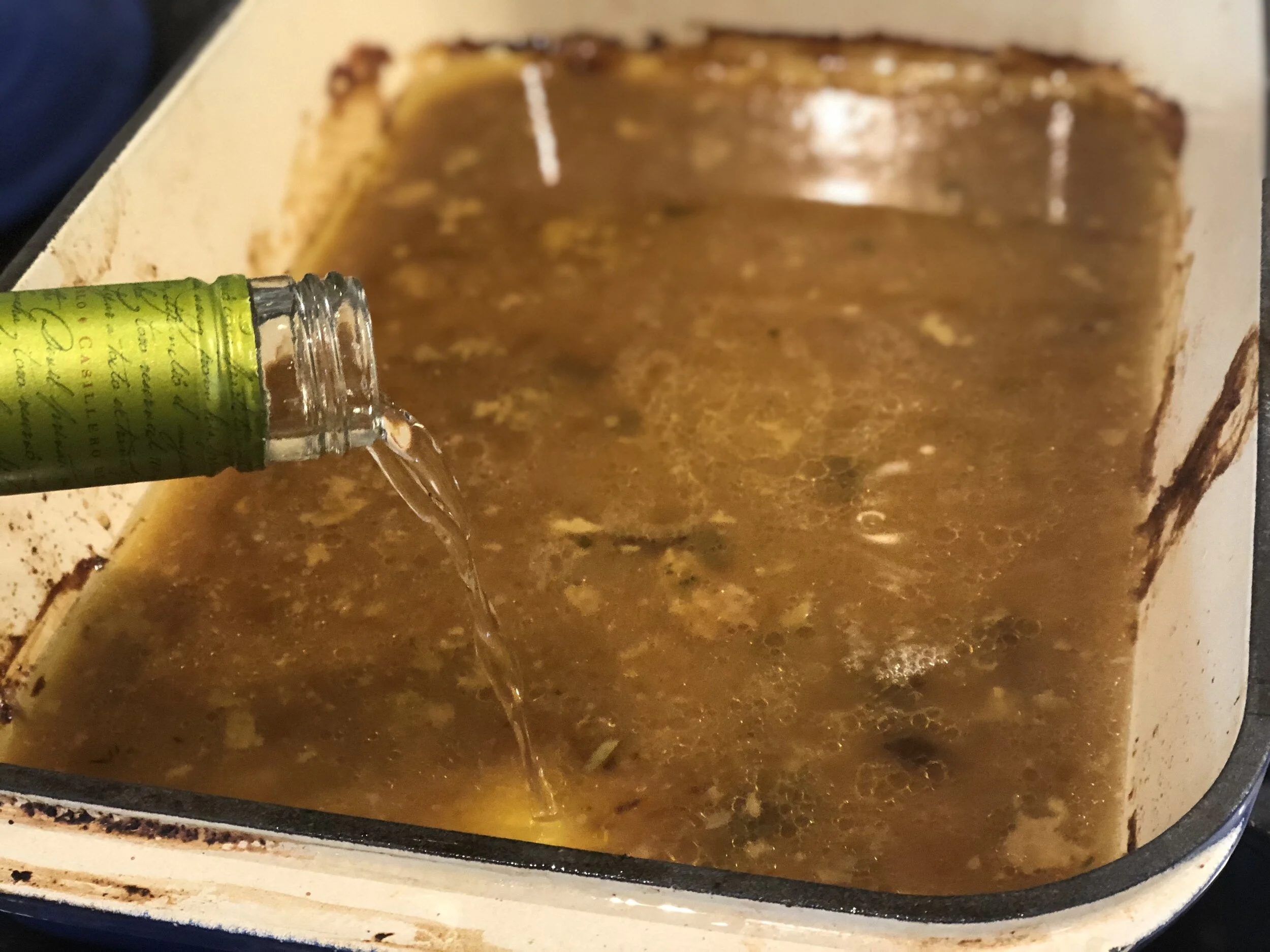 Once that’s done I pulled the turkey out of the pan, removed the stuffing, and left the pan on the stove to make gravy. I added a cup of chicken broth and a cup of white wine to the pan drippings.